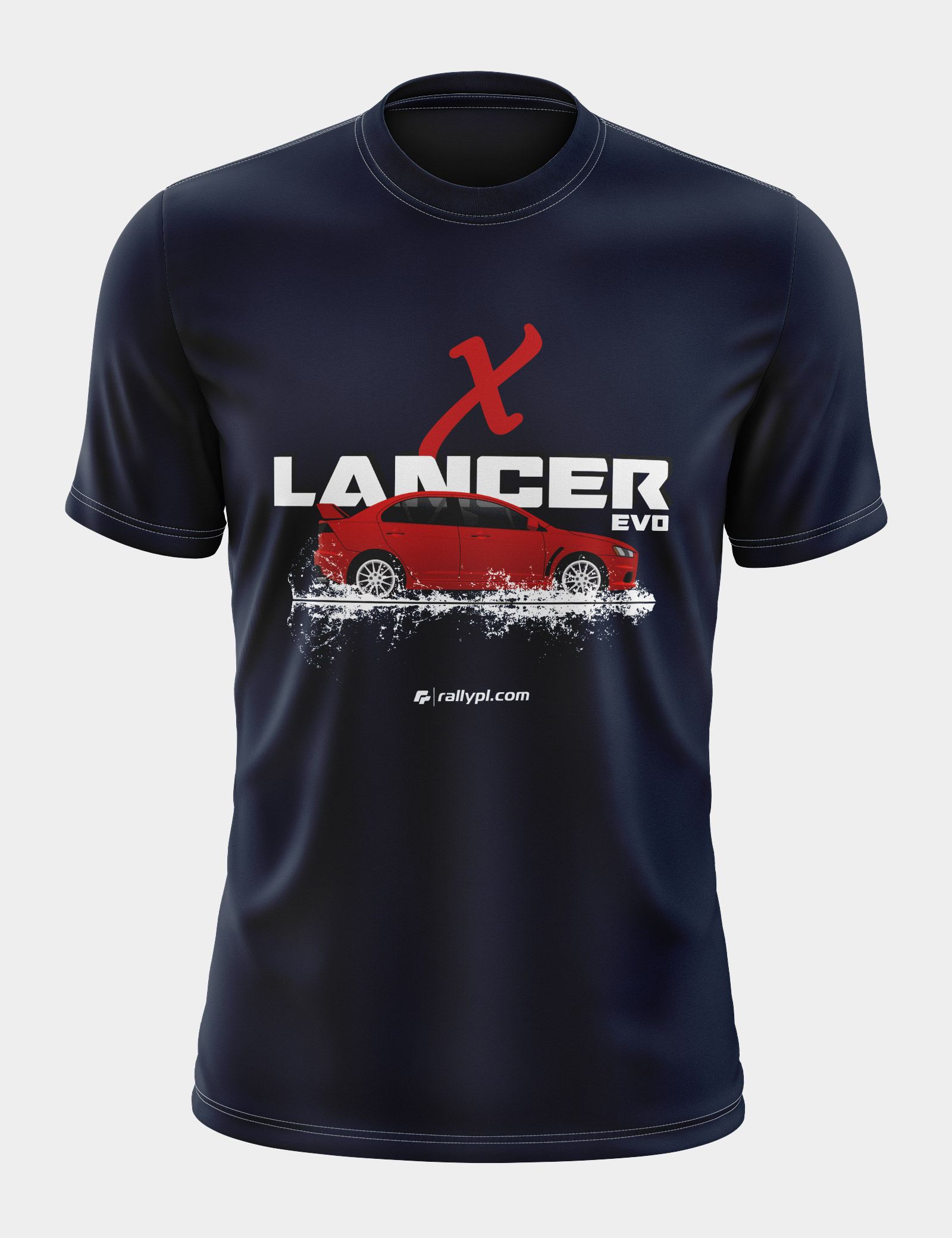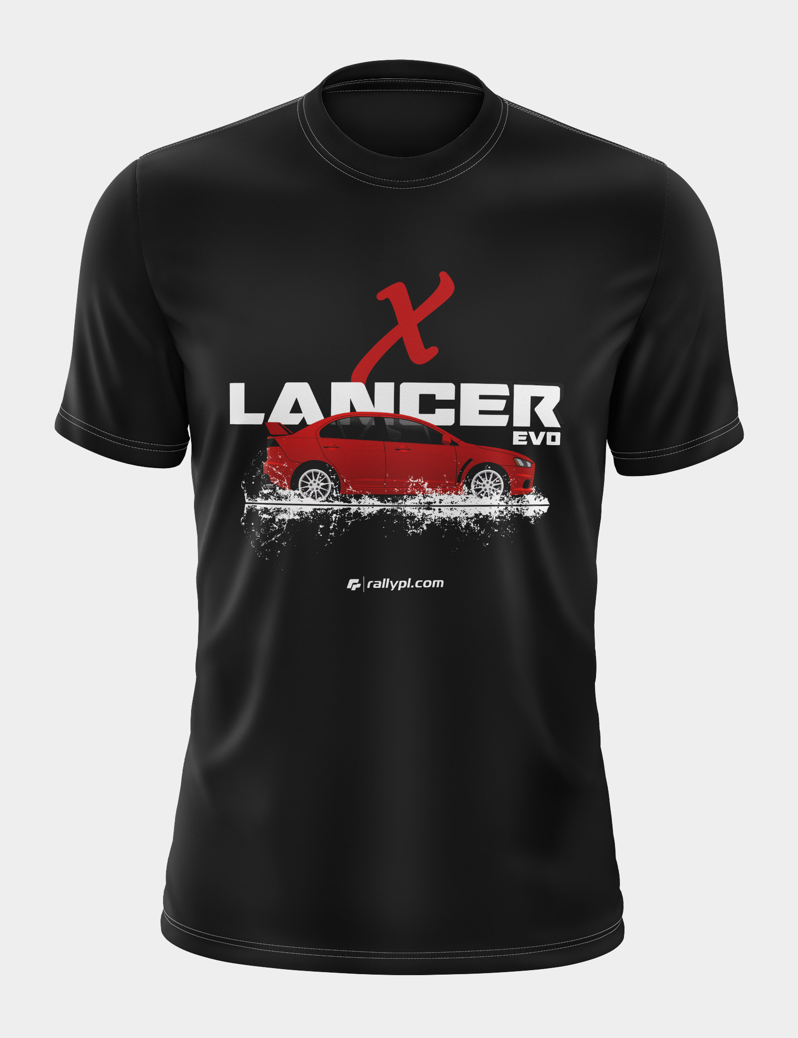 Czerwona legenda w akcji! Mitsubishi Lancer EVO X w dynamicznym ujęciu, z efektem wodnego rozprysku i brandingiem rallypl.com. Idealna dla fanów japońskiej mocy i rajdowej pasji.